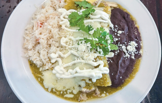 Her plate’s presentation was equally impressive. There wasn’t any wasted space — the two enchiladas in the middle, flanked by servings of rice and beans. In fact, both of our entrees almost looked too good to eat.