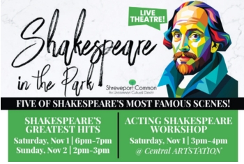 CADDO COMMON PARK: The Shreveport Regional Arts Council presents: Nov. 1 from 6-7 p.m. Shakespeare’s Greatest Hits performed by Texas Shakespeare Festival Roadshow and Nov. 2 from 2- 3 p.m.; 869 Texas Ave., Shreveport.